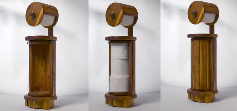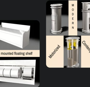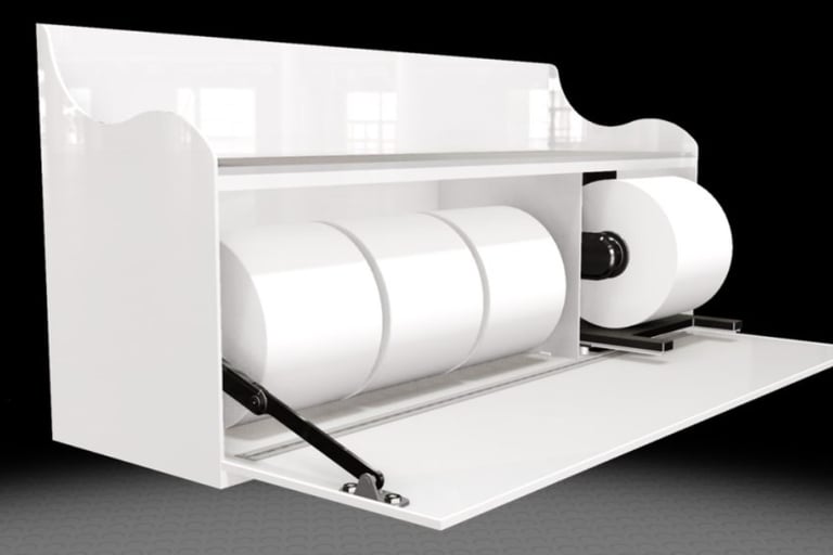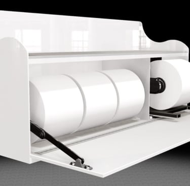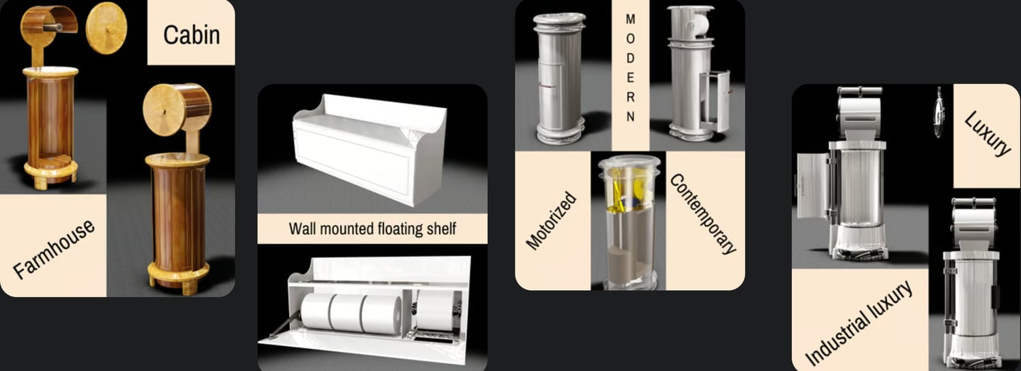 The examples below are future products and illustrate that with thoughtful design and innovative approaches, it is possible to seamlessly incorporate practical toilet paper storage solutions into elegant bathrooms, enhancing both their functionality and visual appeal.